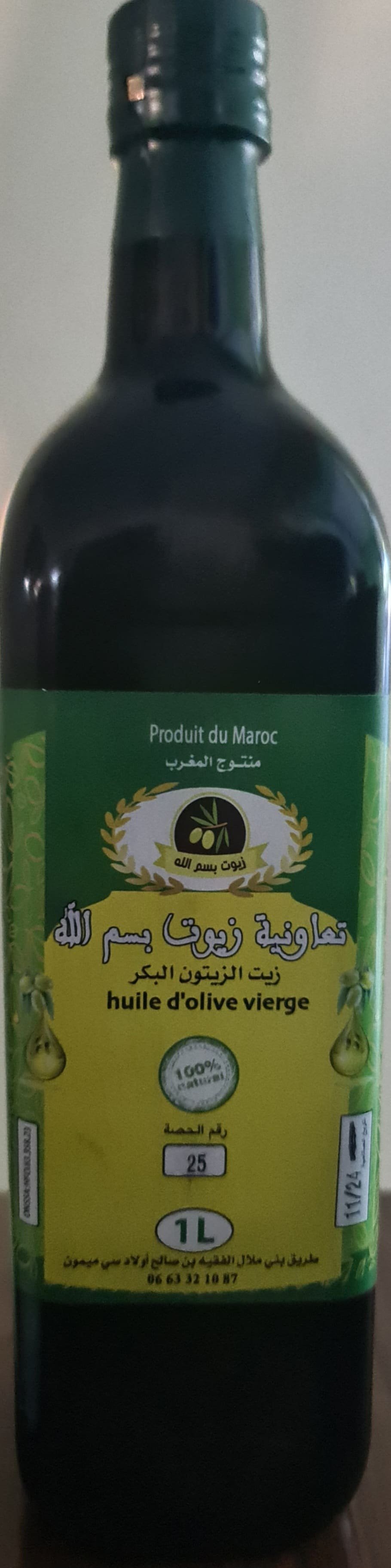 زيت الزيتون البكر من إنتاج تعاونية زيوت بسم الله. الحاصلة على شهادة ONSSA. معبأ في قنينة زجاجية تحافظ على جودة الزيت
